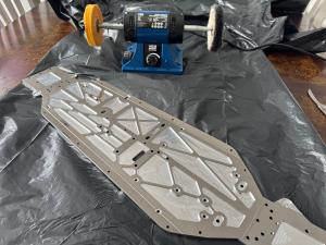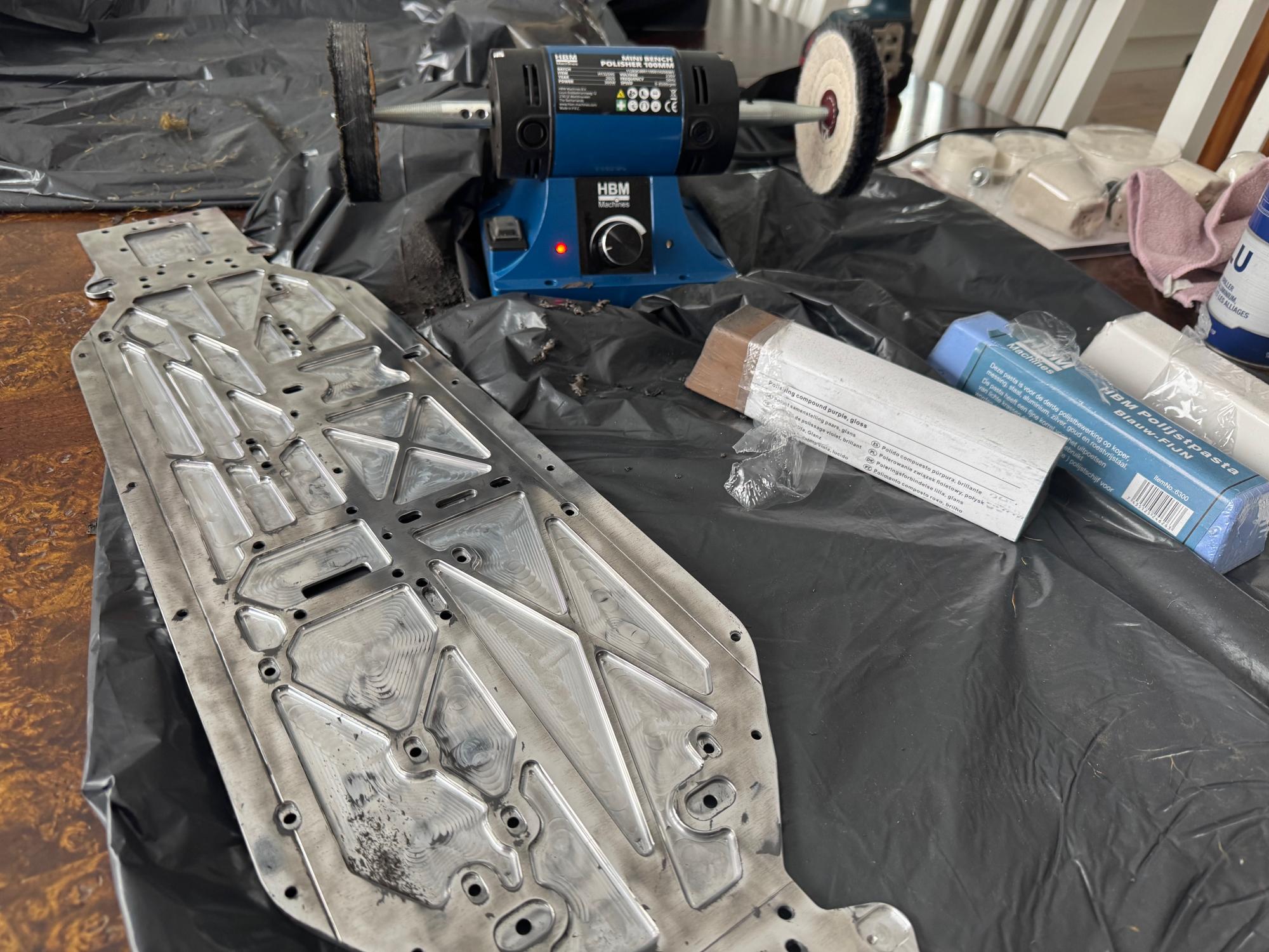 Before receiving the car I started looking into what others are doing to make their aluminium shine and I bought a case tumbler from Hornady. I also bought a polish machine from HBM as well as some polishing paste from Belgom and some polishing stuff to put on the drilling machine. Since most of the aluminium parts are already very shiny as new you don't really need to polish them in the tumbler or the machine. But the chassis had an untreated surface as it was only milled where it makes the cutouts. You can see in the picture below how that creates two different surfaces. I wanted it all to shine and decided to go with the polishing machine.