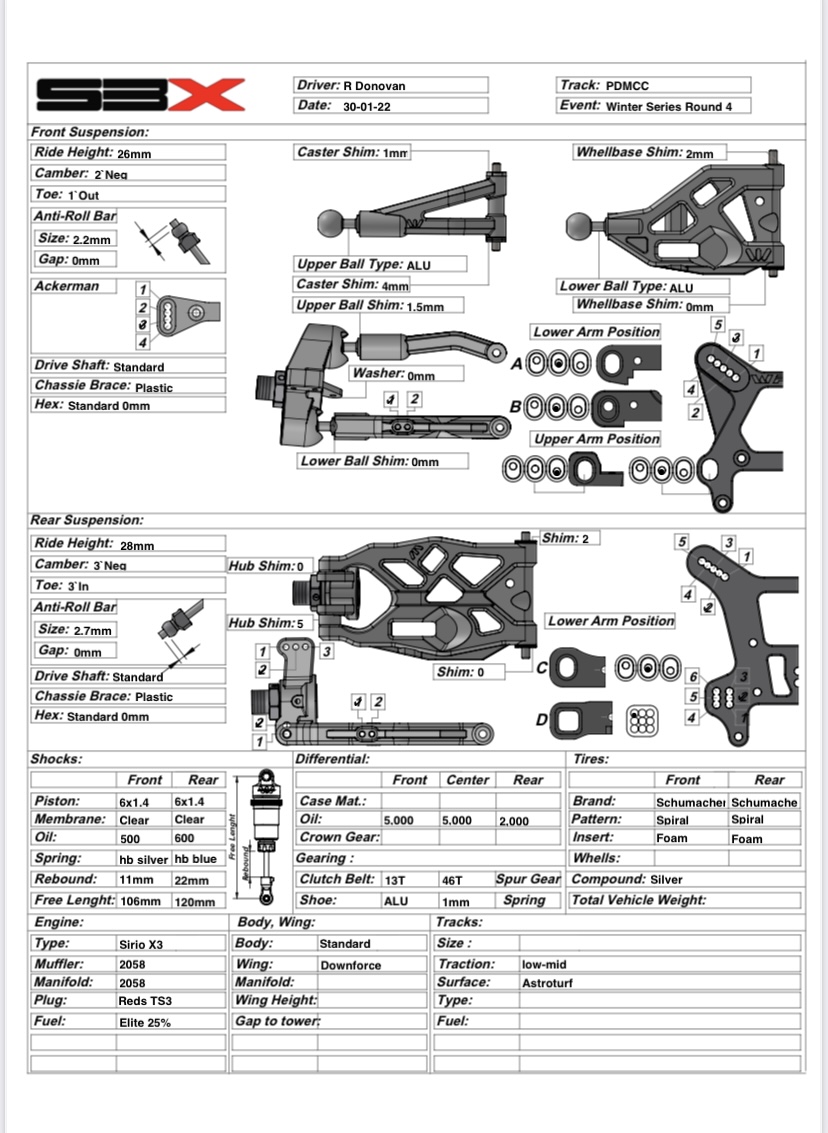 The cars we race are 1/8th scale buggies, radio controlled 4WD nitro powered and race on our astro turf off road track. They are powered by 3.5cc glow engines producing around 2 bhp. Giving them a top speed of 60 mph and an ability to reach this speed in 3 seconds or so.