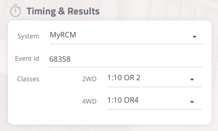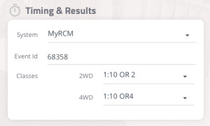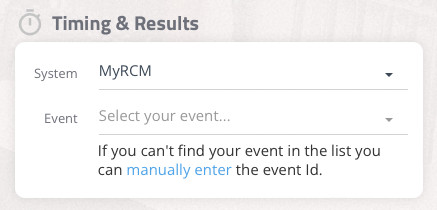 - Har man angivit samma namn i House of RC som i tidtagningssystemet så hittas tävlingen automatiskt annars kan man behöva välja tävlingen i en lista. Hittar man den inte i listan kan man manuellt skriva in tävlings ID som man hittar i tidtagningssystemet.