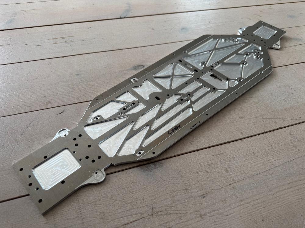 Since most of the aluminium parts are already very shiny as new you don't really need to polish them in the tumbler or the machine. But the chassis had an untreated surface as it was only milled where it makes the cutouts. You can see in the picture below how that creates two different surfaces. I wanted it all to shine and decided to go with the polishing machine.